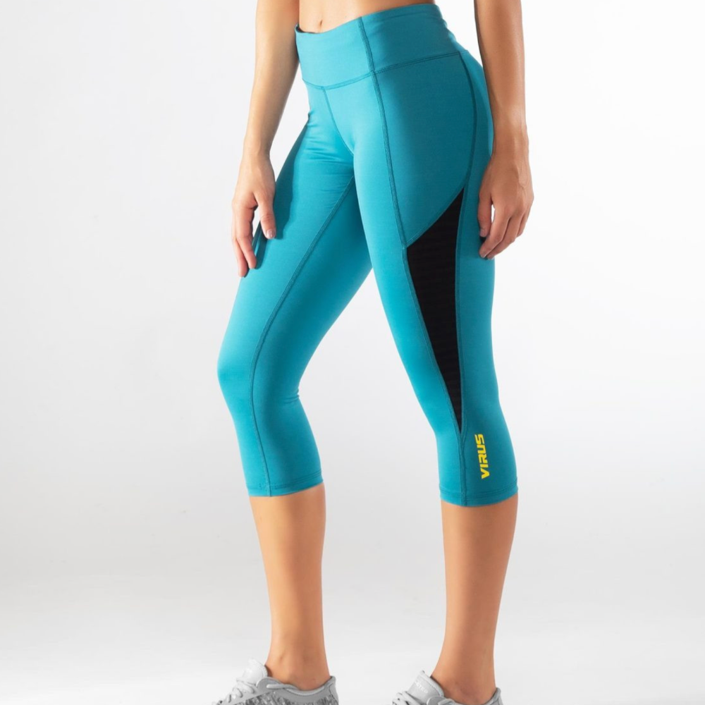 The VIRUS ECO57 ECHO COMPRESSION CROP PANT - Blue features a 3" waistband and a new single loop non-removable drawstring with welded eyelets. Its durable construction and advanced nano-technology optimize athletic performance and accelerate the healing of injured tissues and tendons.